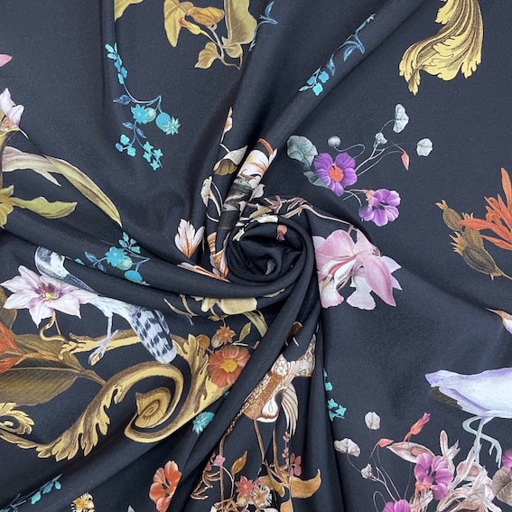 Oszczędź 44%Klasyczna, cienka krepa jedwabna – krepdeszyn w kolorowe kwiatki, ptaki i ornamenty na czarnym tle. Materiał jest lekki, zwiewny oraz lejący, o bardzo delikatnym i przyjemnym chwycie. Idealny na bluzki, sukienki, topy, zwiewne spódnice, luźne spodnie, kombinezony. Jedwab krepowy będzie doskonały również na ekskluzywną bieliznę nocną. Tkanina dostępna jest w innych wariantach kolorystycznych.