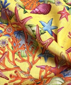 Miękki, włoski, drukowany len we wzór darów morza na żółtym tle. Tkanina jest przewiewna, nieprzezroczysta, nadająca się na sukienki, luźne spodnie, tuniki, bluzki, szorty, parea, spódnice. Materiał jest nieświecący, matowy, doskonały do stworzenia nietuzinkowego stroju. Nie wymaga podszewki. Len jest do prania w wodzie.