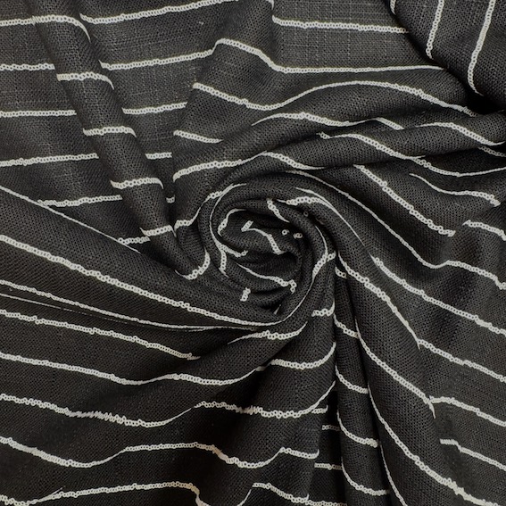 Ta włoska tkanina to elegancka mieszanka wiskozy i lnu w głębokim czarnym kolorze. Struktura materiału łączy w sobie lekkość i przewiewność lnu z miękkością oraz subtelnym połyskiem wiskozy, co sprawia, że jest idealna na letnie i eleganckie kreacje. Charakterystycznym elementem są cienkie, białe paski ozdobione cekinami, które dodają tkaninie wyjątkowego blasku i efektu glamour. Cekiny delikatnie odbijają światło, tworząc luksusowy i subtelny efekt dekoracyjny. Tkanina świetnie sprawdzi się na zwiewne sukienki, tuniki, bluzki, a także na stylowe dodatki, nadając kreacjom wyrafinowanego charakteru.